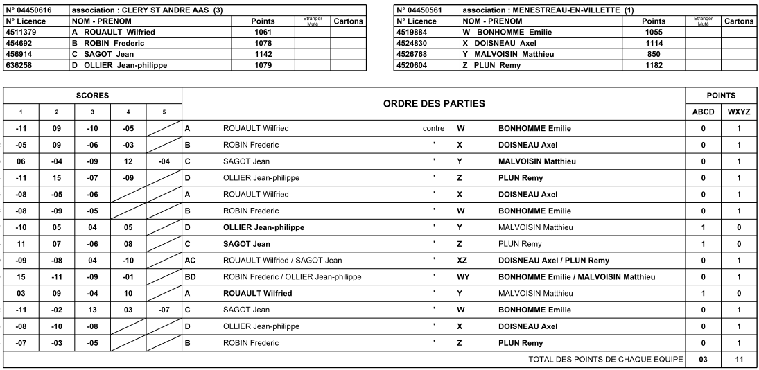 Départementale 2 : CLERY 3 - MENESTREAU 1 : 3/11